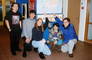 部屋に帰ってみるとジョーとボブはいなくなっていたけれど,トルモッドとス ティアンというノルウェーからアイスランドへの留学生の2人連れが来ていた. ロイガルバトゥンという田舎町にある大学(アイスランドではほとんどの高等 教育機関が田舎にあり,全寮制)に通っているらしい.それで彼らは役所の手 続きとか買物をするためにこの週末の3日間,レイキャビクに来たのであった. 今日はオーロラを見ていないと言っていたが,アイスランドに住んでいるなら (しかも田舎に)大して珍しくもないんだろうな.