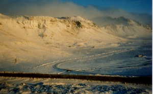 レイキャビクの近くで国道から外れて山道に突入.どんどん雪が多くなるが, 道路上は除雪されているのであまり問題はない.すれ違う車も全くなし.傾斜 がどんどん急になる.りーは「行きたくない」と言うがみんなが行け行けと言 う.前にすごく急な登り坂が現れる.リーがためらっていると反対側から4WD が来た.ほう,こんな時間に来る奴がいるもんだ.リーは「4WDじゃないと無 理だ」と言って行こうとしないが,とりあえずそこの坂だけ登った.登り切っ たところで,雪の吹き溜りがあり,そこへ突っ込んで車は前に進めなくなった. バックして抜ける.ここから先は無理みたいなので,その辺を歩く.もう少し で峠みたいなところで,前に見える山が雪を被っていてとても恰好いい.真っ 暗だったが,残念ながらオーロラも消えていた.そのへんで写真を何枚か撮っ てレイキャビクへと引き返した.