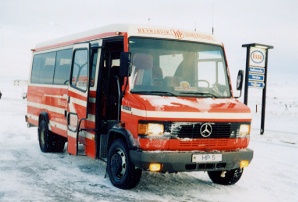 8時半を過ぎたころ小さめのバスが入って来た.こんな小さなバスなのか.実 は8時半にグルンダルフョルドゥルという町に行くバスも出ることになってい る.途中までは道が一緒みたいなので,「乗り換えなきゃいけないのかな」と 思って受付の人に聞いてみたが,よくわからないみたい.とりあえず運転手に 聞けと言う.そんなものなのかなと思いながらバスに乗り来んだ.日本のマイ クロバスぐらいの大きさのバスで結構席は埋まっていた.当然のようにスパイ クタイヤをはいていて,どんな道なんだろうかとちょっとわくわくした.